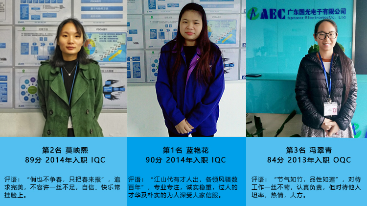 此次競賽的過(guò)程和結果,質(zhì)管部 QE團隊將組織進(jìn)行細致的分析總結,結合制定2018年培訓計劃,務(wù)求給QC技術(shù)員更有價(jià)值的系列培訓,秉持質(zhì)管部“團結、開(kāi)拓、務(wù)實(shí)、求精”的作風(fēng),為AEC品質(zhì)把好第一道關(guān),為客戶(hù)創(chuàng )造價(jià)值。